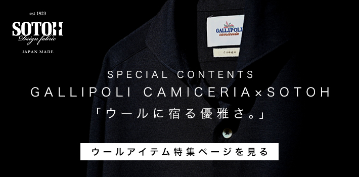 さらにSOTOH独自のカシミヤタッチの高級感に溢れた風合を付与するウールの特殊加工、イージネス加工により、ウール特有の毛羽立ちを抑えつつ、上品な艶感としっとりしたヌメリ感をプラスしています。